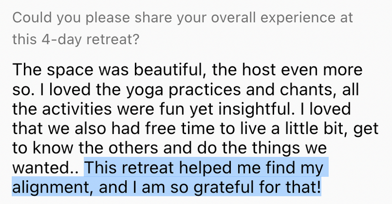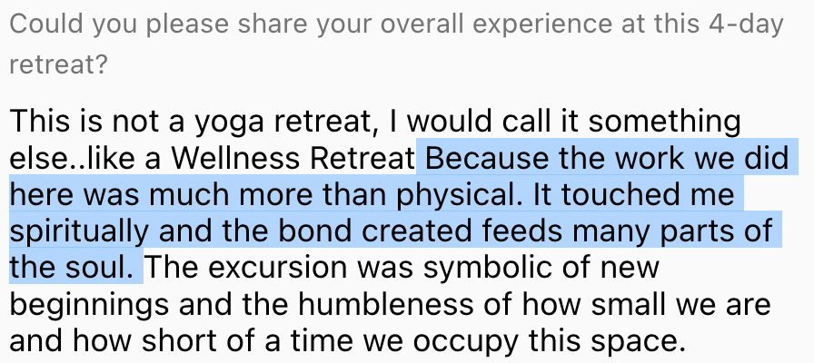 "I joined this retreat by chance. I had resistance at first because I didn't know if I should go through the hassle of taking a few days off my life, meeting new people etc.
